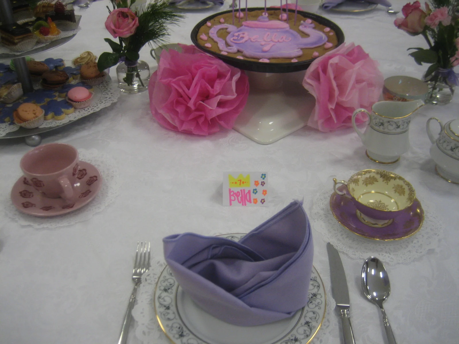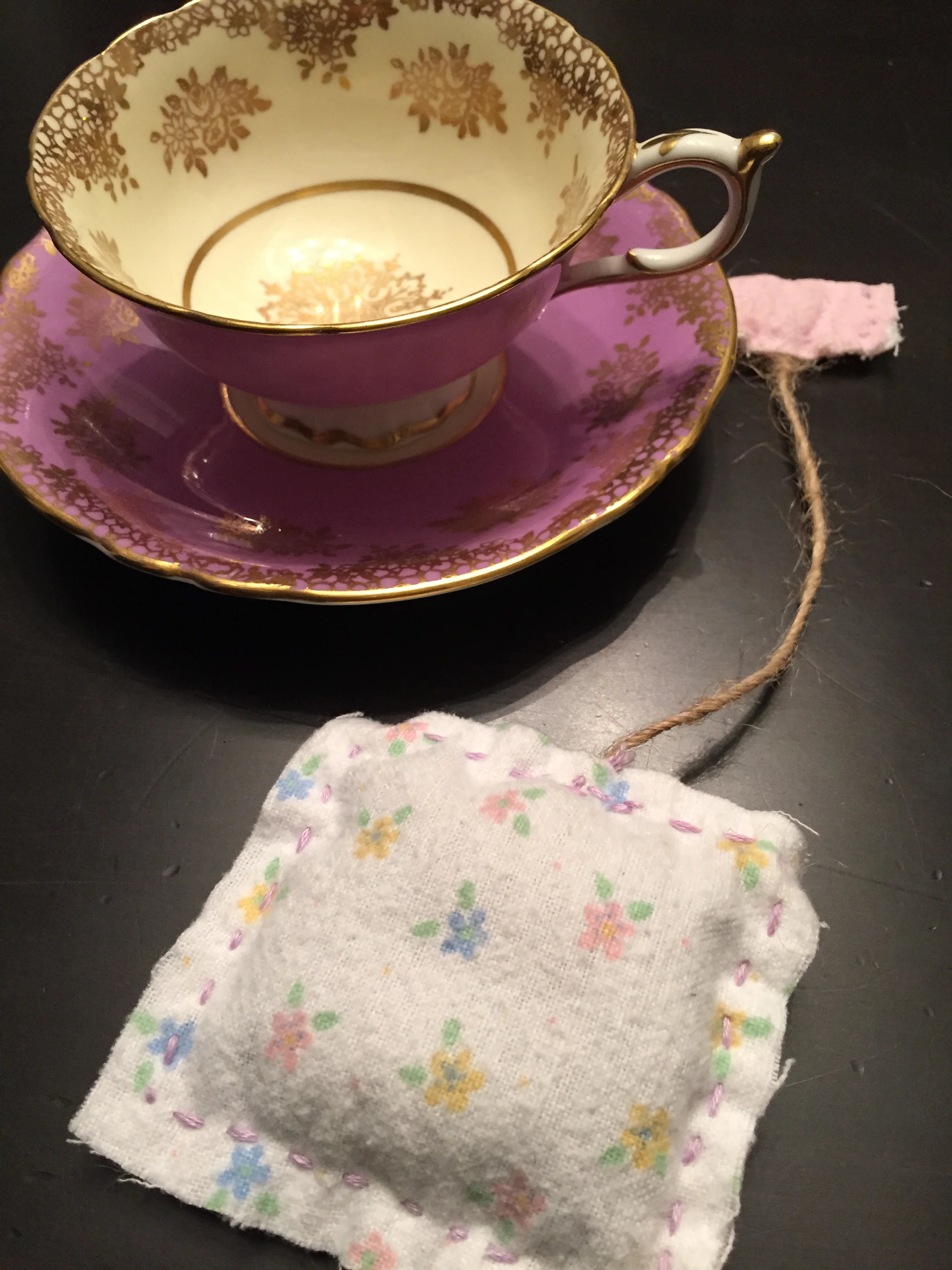 This is a very special tea cup passed down generations to my daughter, not to be mistaken for ones we bought at Good Will. The cloth was different on each side of the tea bag, filled with lavender and sewn together by family and friends. Thanks Jay-Jay, Raleigh and Heather Dinger! Total cost per goodie bag: $2 for cup and saucer, $1 for lavender, cloth, twine and embroidery thread = $3 each for 12 girls - $36.