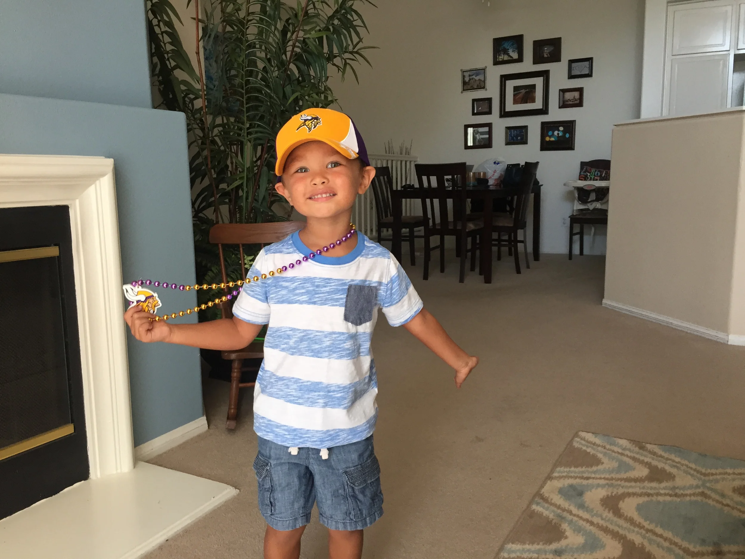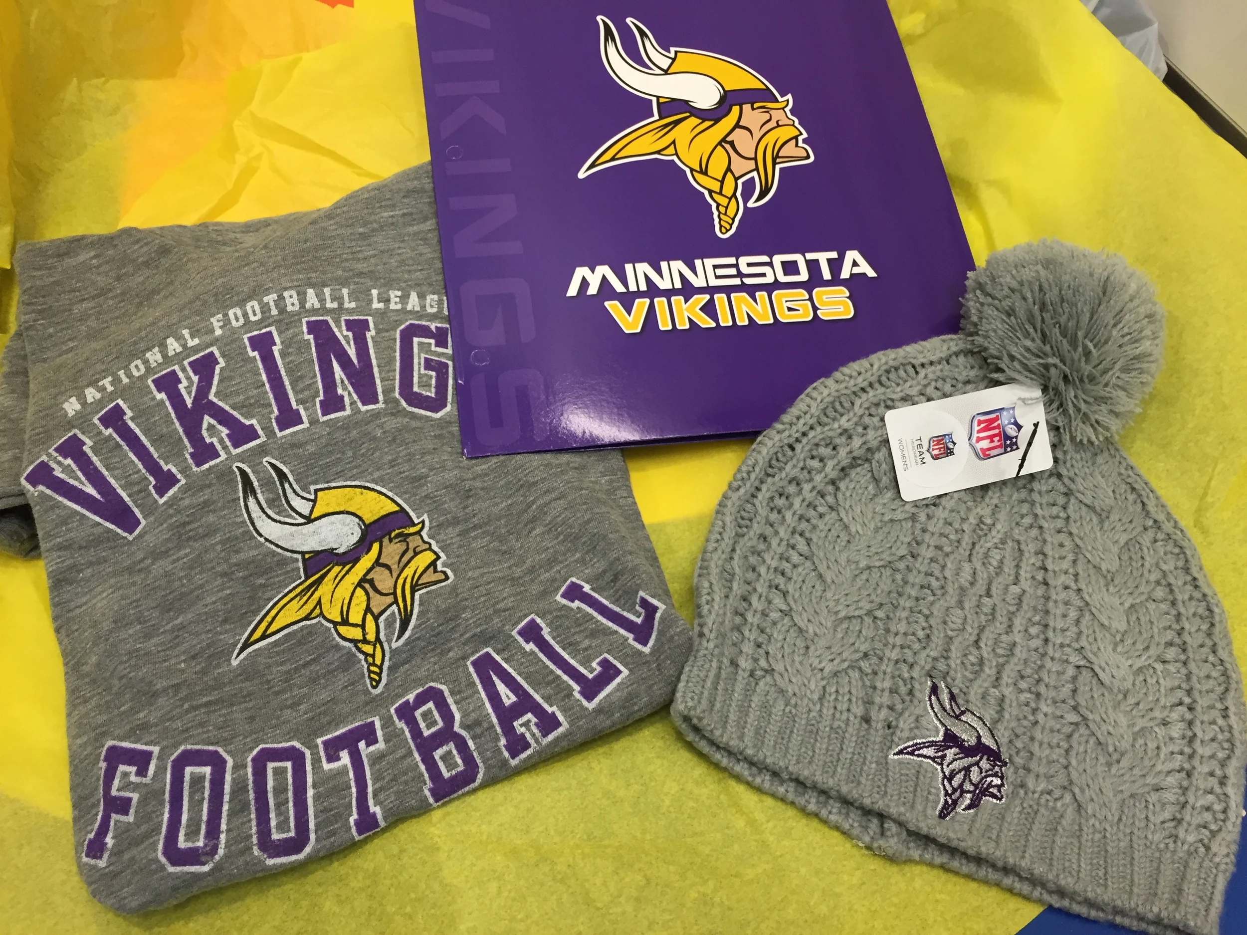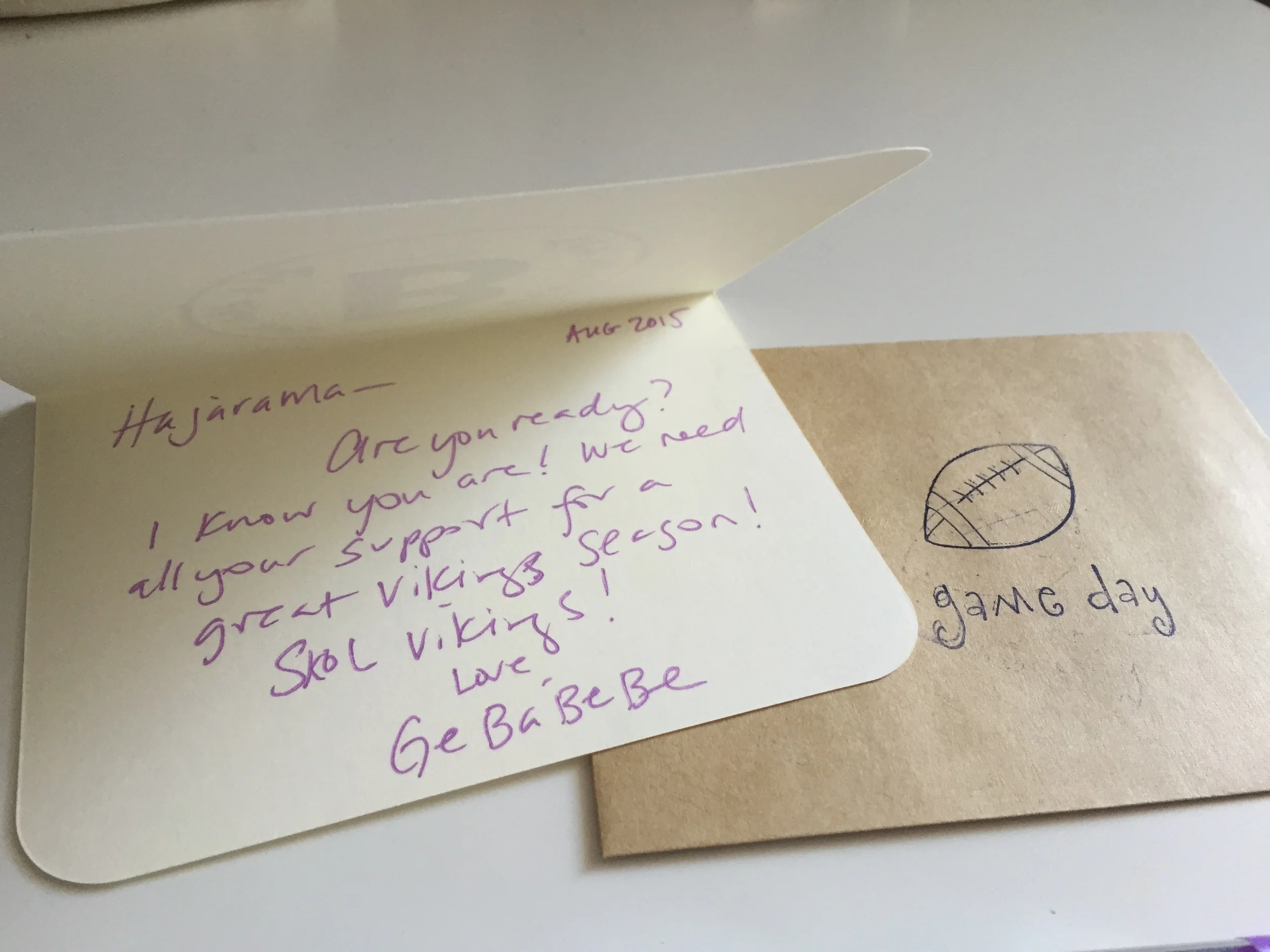 I sent flavored licorice (some purple grape and some "supposed to be yellow but was beige" pina colada), a bag of football shaped pasta and a note to encourage our family to cheer the Vikings on! Skol!
