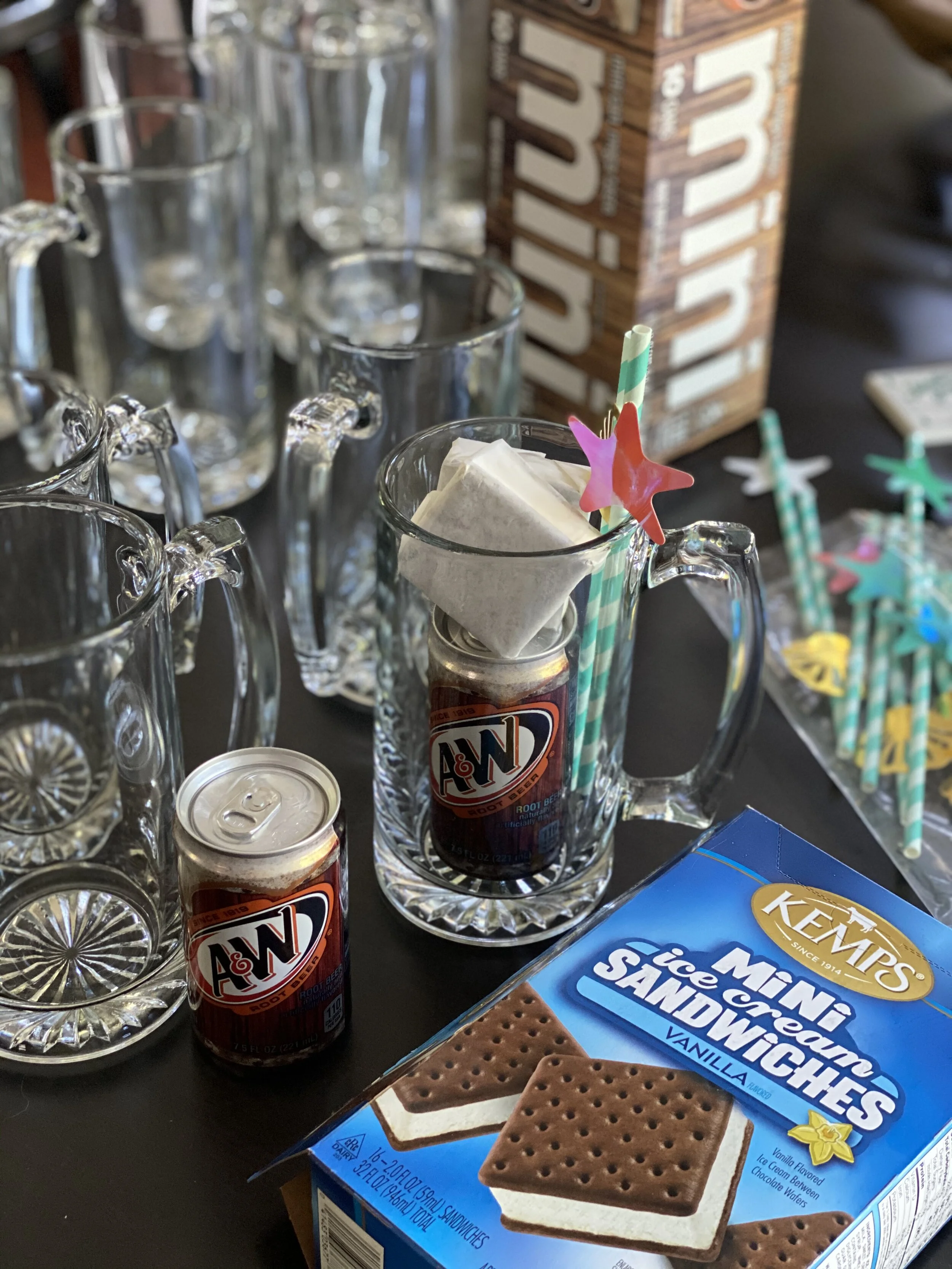 #3. Local but Mini + Chocolate - On Pinterest, a common theme for the root beer float was the addition of chocolate. I thought this would be a cute, efficient way to make a root beer float. First, take everything out of the giant mug. Unwrap the mini ice cream sandwiches and place them back into the mug. Pour root beer over the ice cream sandwiches. Then use a tall spoon or a straw (if it’s stronger than paper straws) to break up the sandwich. It’s an instant version of a chocolate root beer float. This package would need to be delivered to someone close by and could not be mailed or left outside for long.