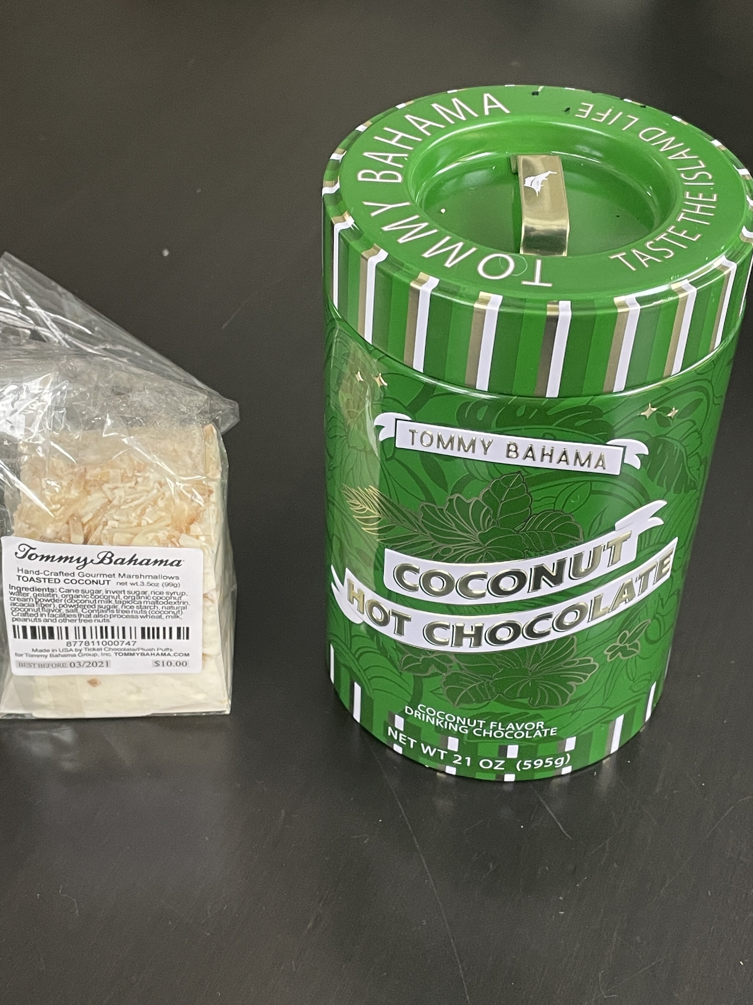 This is my son’s Xmas gift from my in-laws. This takes hot chocolate to a whole new level. Adding the tropical feeling of being on vacay. It’s like a Mounds Bar in a cup. Did you see the marshmallows? I had to do some quality control to make sure they were good enough for my son and I can report: Um, delish!