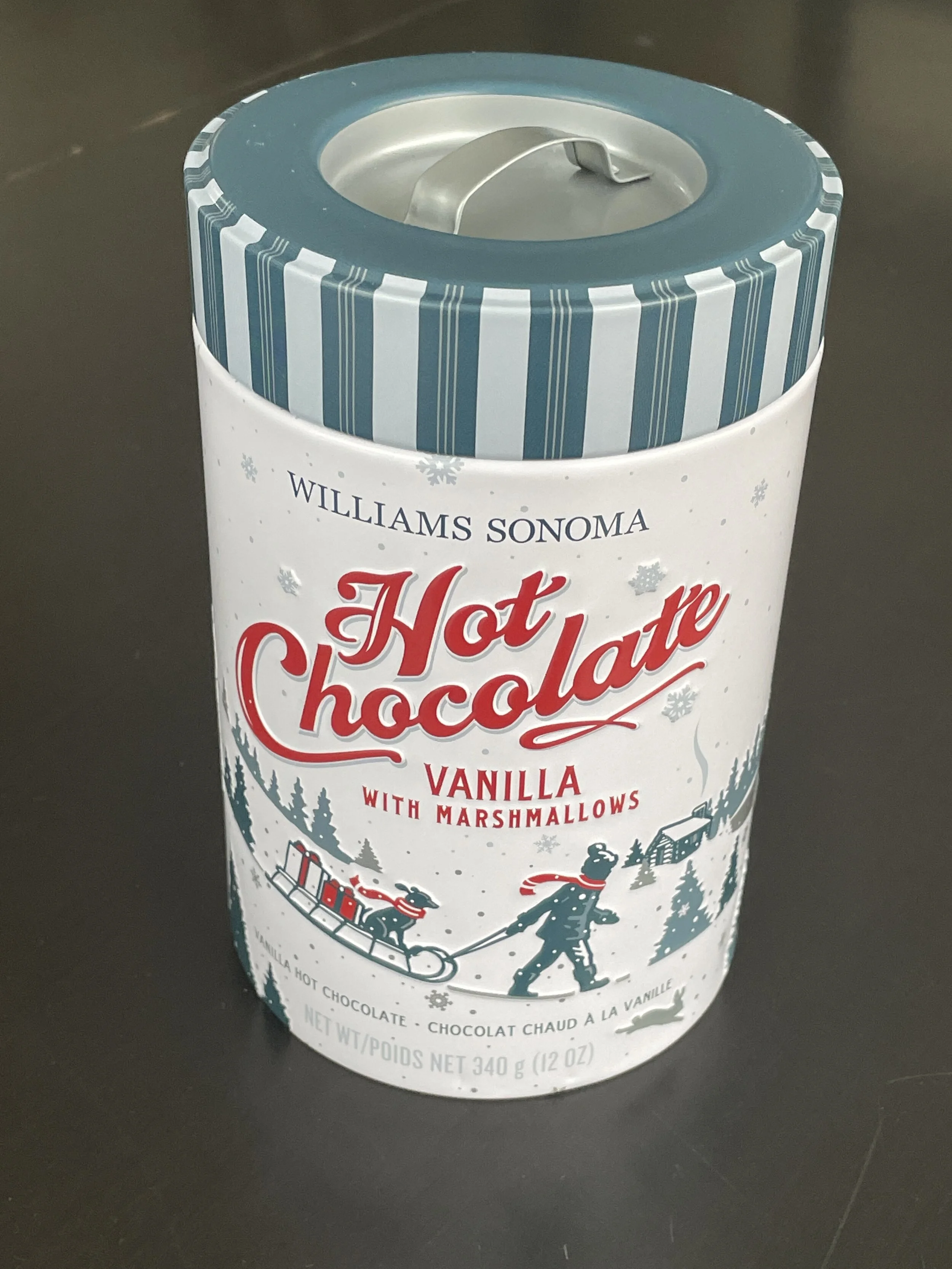 Speaking of Dana, because I’m lucky to have a neighbor like Dana who is so thoughtful, I received this for Xmas last year. I know it must be very good because there are shavings of both chocolate and vanilla chocolate and it’s my son’s favorite. This is the real deal. Speaking of Dana, she once gave our family her own homemade version of hot cocoa mix and homemade marshmallows. Sweat equity gifts are her jam; she is so good at putting in the work to let us know we are special. That was a favorite for sure!