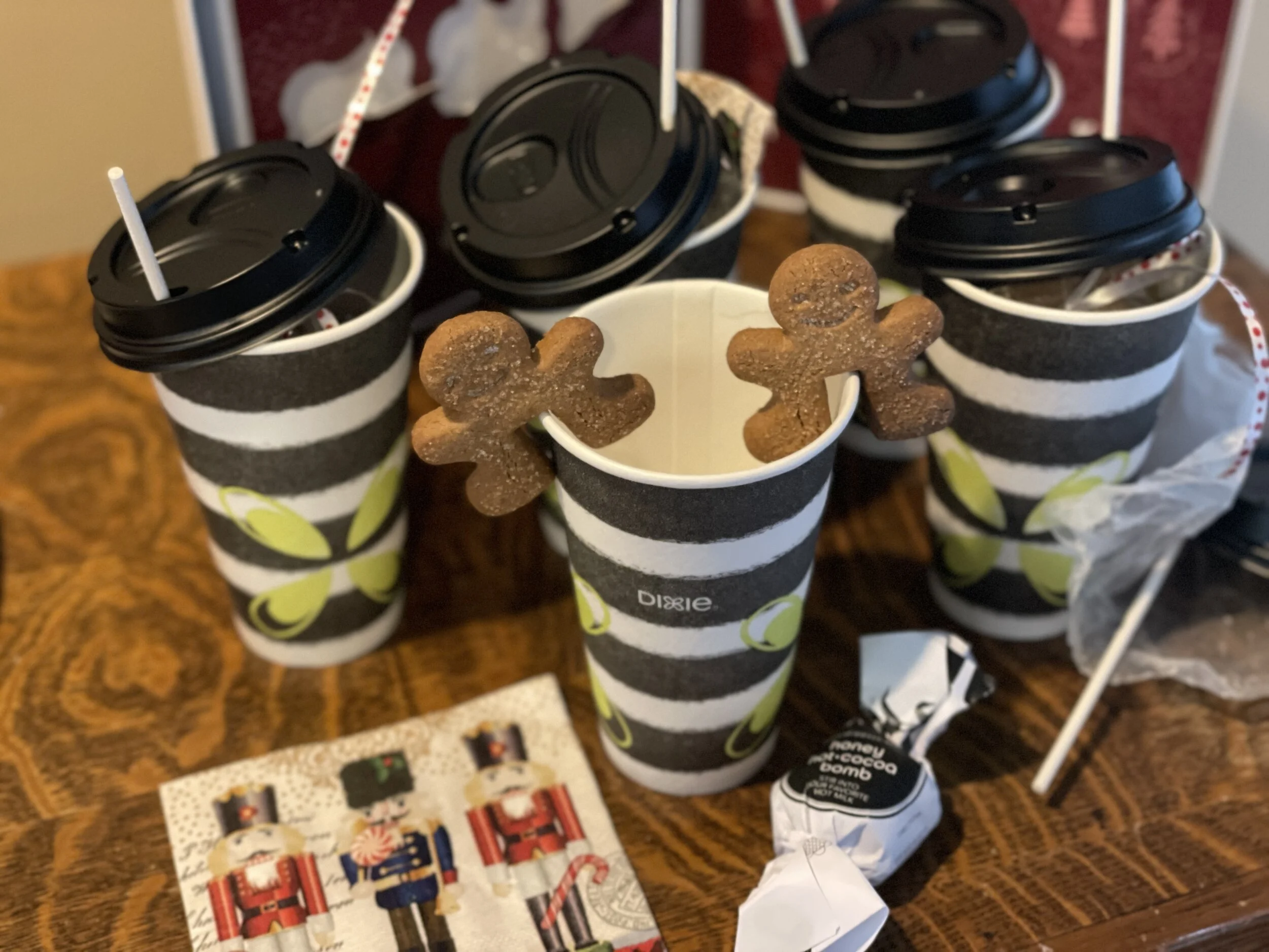 Katie gave us the cocoa bombs in these cups with gingerbread men, stirrers and Nutcracker napkins. So cute!