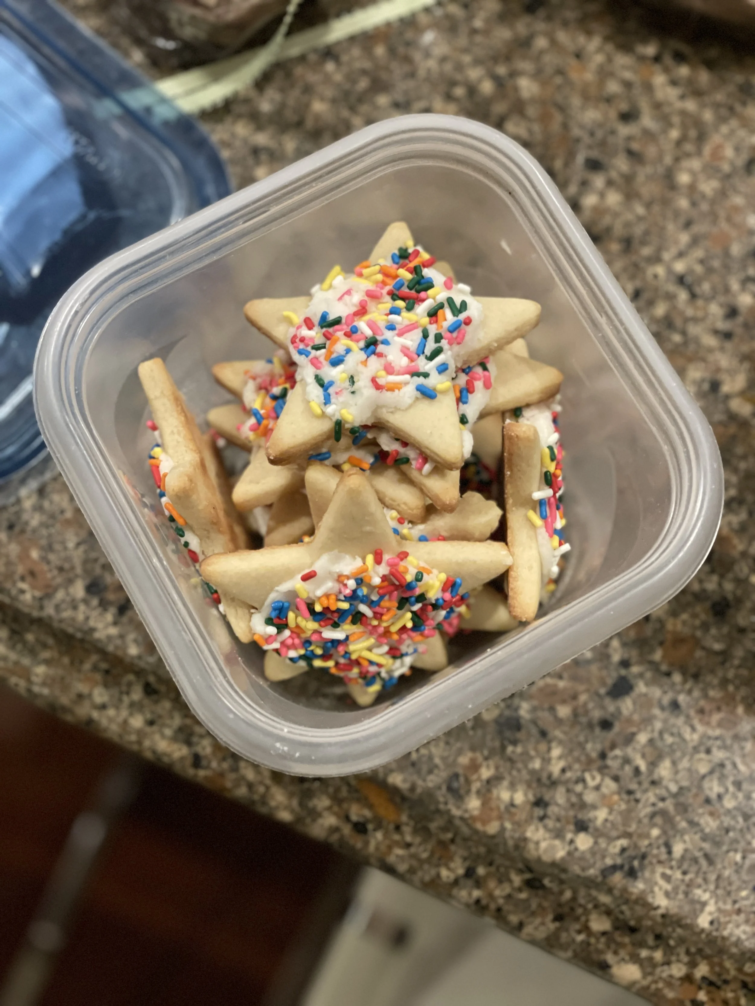 Molded or “cut outs” sugar cookies baked by my neighbor Cathy. The sprinkles add the crunch and the extra sweetness.
