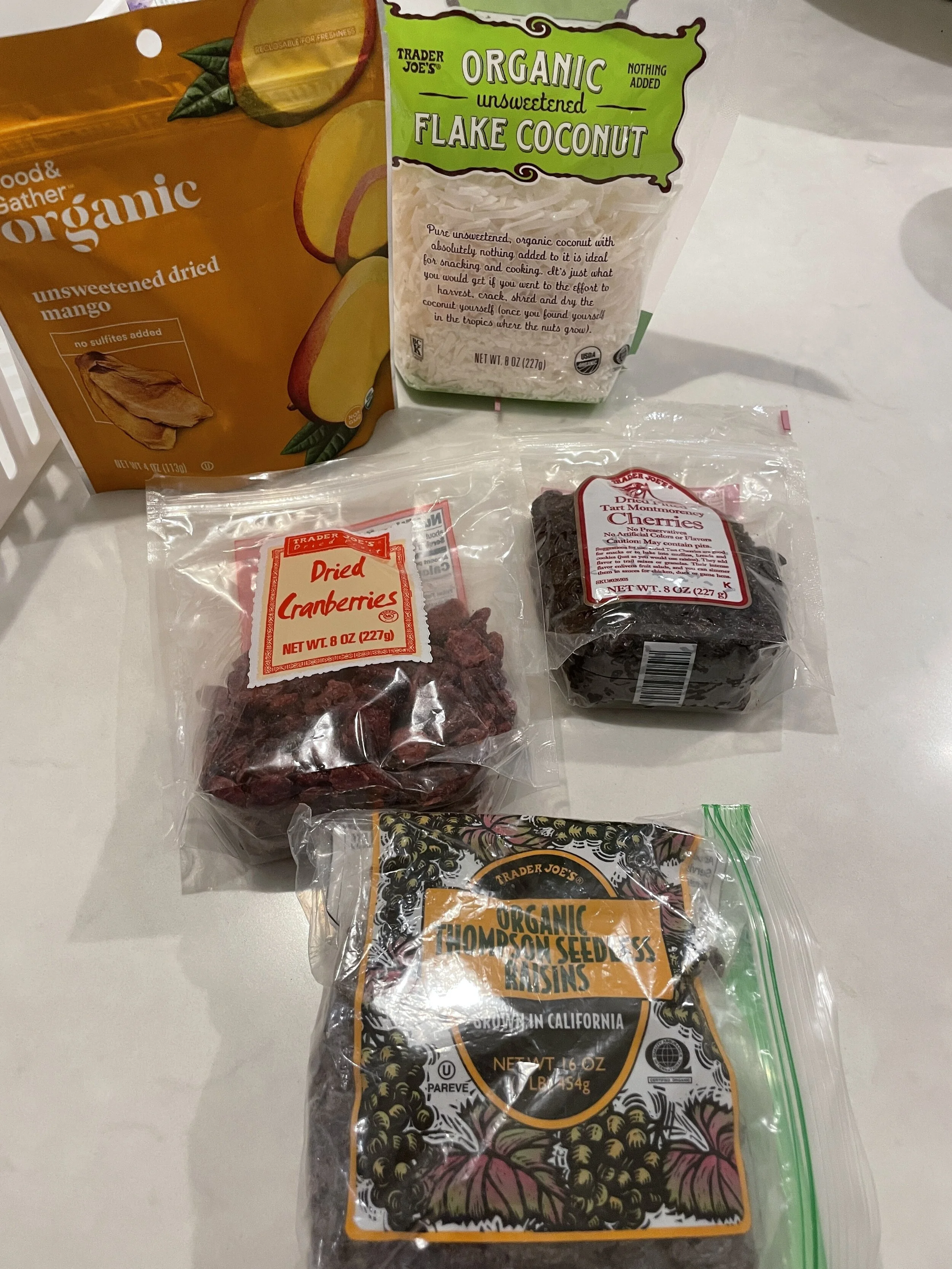 We always have bags of dried fruit. We toss in salads, cook and bake with or eat straight out of the bag.