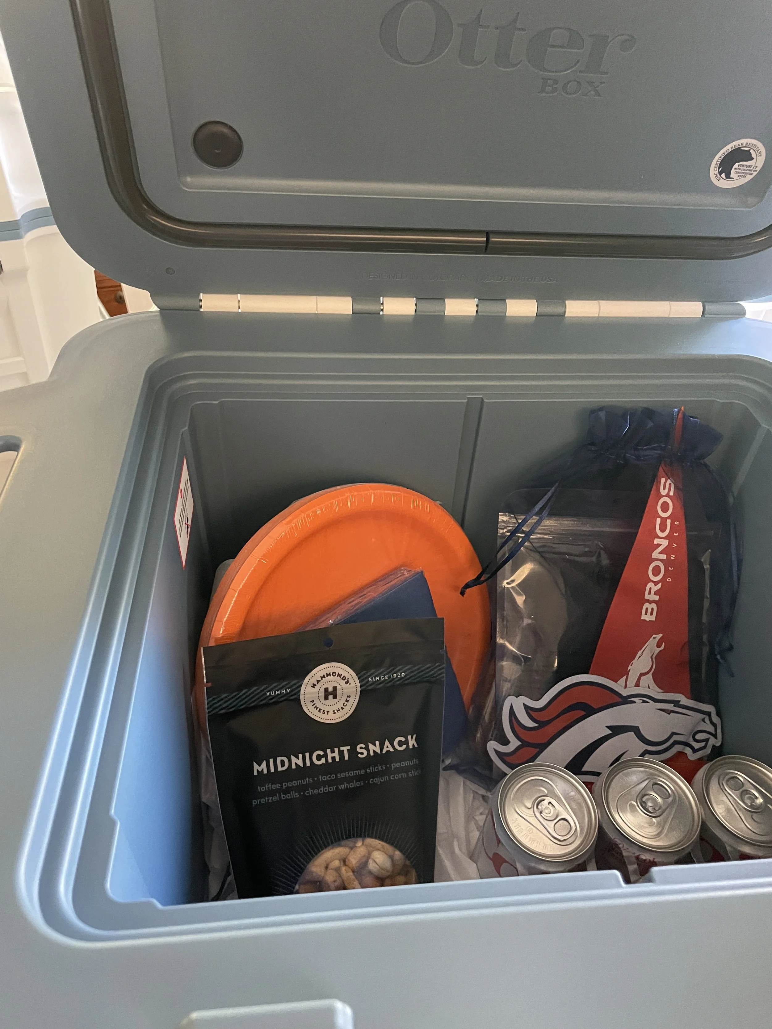 Each cooler contained tailgating items - including some locally made snacks.