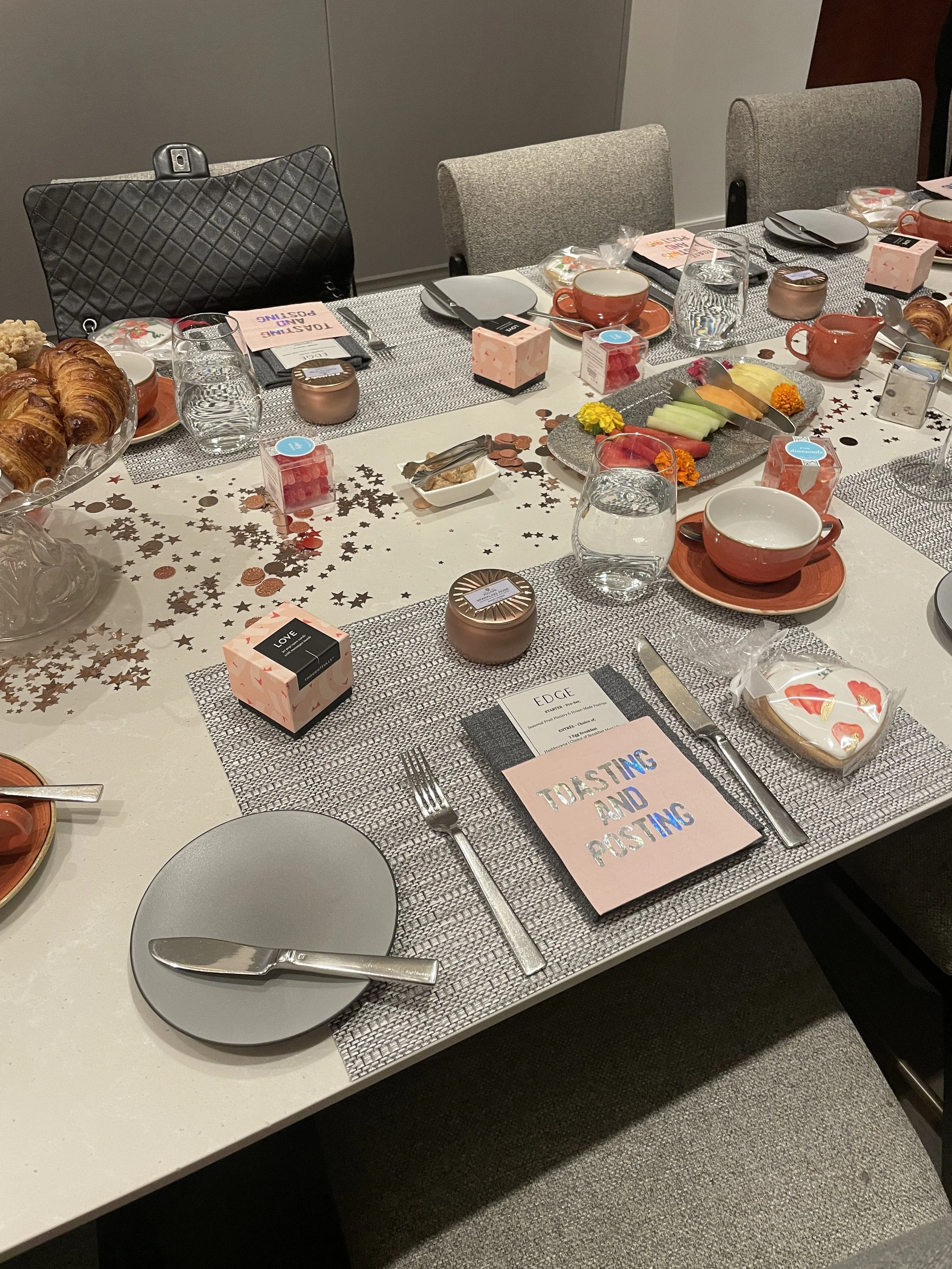 Rachel set the table herself and included many, many, many treats for us to take home. Love the napkins Toasting and Posting.